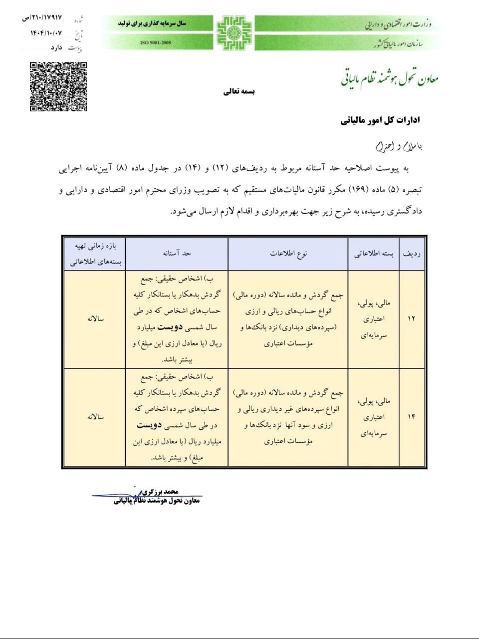 اصلاحیه حد آستانه مربوط به ردیفهای (۱۲) و (۱۴) در جدول ماده (۸) آیین نامه اجرایی تبصره (۵) ماده (۱۶۹) مکرر قانون مالیاتهای مستقیم در ارتباط با ارائه اطلاعات معاملات انجام شده توسط شرکتهای دولتی و بانکها با اشخاص حقیقی و حقوقی مصوب وزیران اموراقتصادی و دارایی و دادگستری ابلاغ شد.