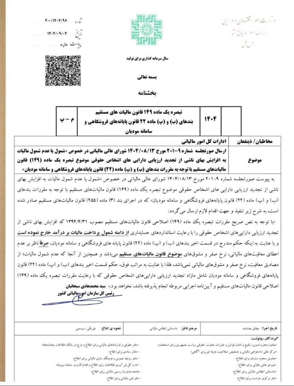 صورتجلسه شماره ۲۰۱۹ مورخ ۱۴۰۴/۰۸/۱۳ شورای عالی مالیاتی در خصوص شمول یا عدم شمول مالیات به افزایش بهای ناشی از تجدید ارزیابی داراییهای اشخاص حقوقی موضوع تبصره یک ماده (۱۴۹) قانون مالیاتهای مستقیم با توجه به مقررات بندهای (ب) و (پ) ماده (۲۲) قانون پایانه های فروشگاهی و سامانه مودیان ارسال شد.