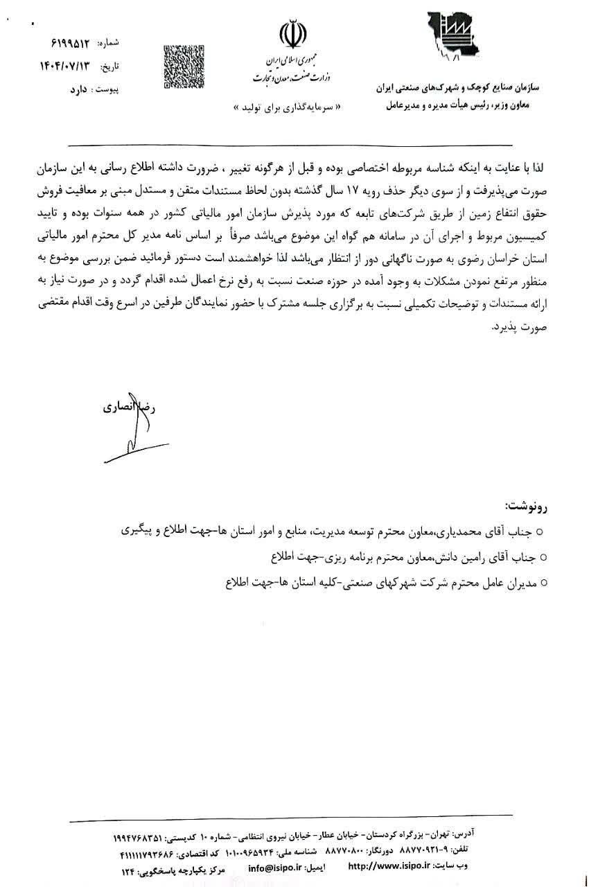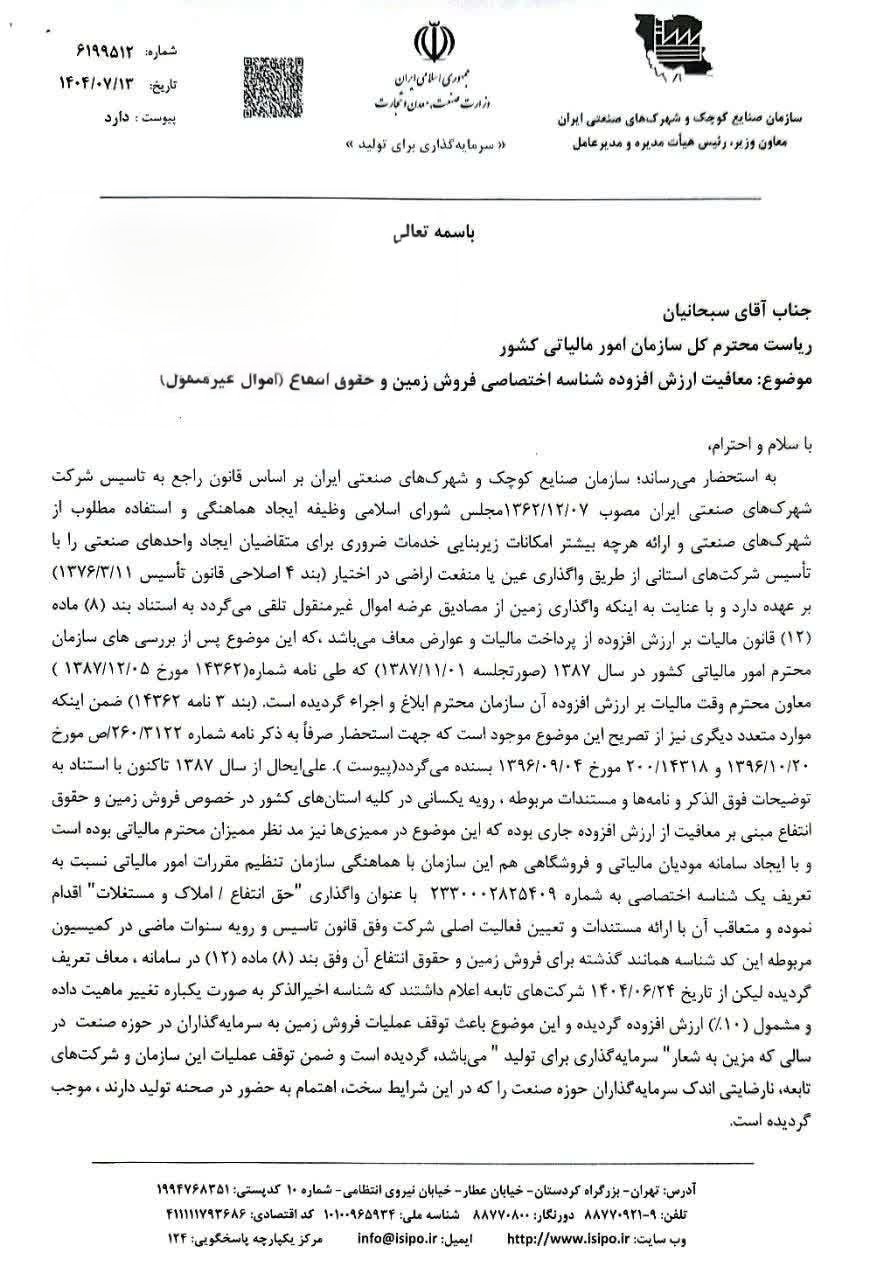 در مکاتبه مدیرعامل سازمان صنایع کوچک، موضوع معافیت ارزش افزوده شناسه اختصاصی فروش زمین و حقوق انتفاع (اموال غیر منقول)در شهرکهای صنعتی مورد تاکید قرار گرفت.